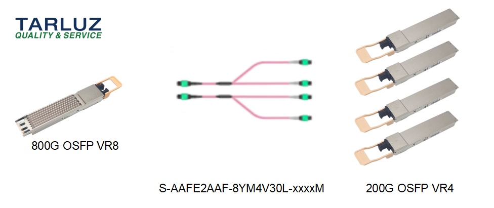 This scenario is suitable for point-to-point cabling. 400G optical modules support 200G transmission by using MPO-8/APC to 2*MPO-4/APC fiber conversion patch cords. A 1×2 MPO-8/APC multimode fiber patch cord can activate two of the four internal lanes of the 400G optical module (i.e., 4 fibers out of the 8 fibers), thereby enabling the 400G optical module to operate equivalently as a 200G device.