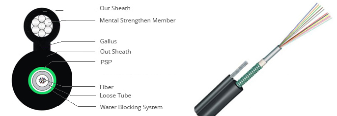 The 250 um bare fiber are positioned in a loose tube made of a high modulus plastic, the tubes are filled with a water-resistant filling compound. The two sides PSP are longitudinally applied over the outer loose tube. Steel wires and loose tubes filled with water proof compound to ensure compact and longitudinally water blocking ,this part of cable accompanied with the stranded wires as the supporting part are completed with a polyethylene(PE) sheath to be figure 8 structure.